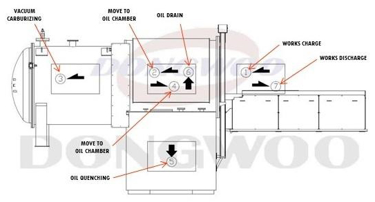 Low pressure atmosphere for heat treating, quenched in same position. Easy control and maintenance.